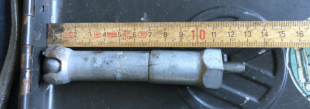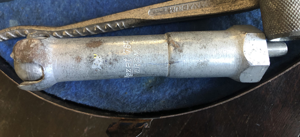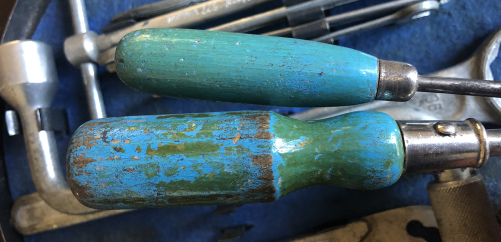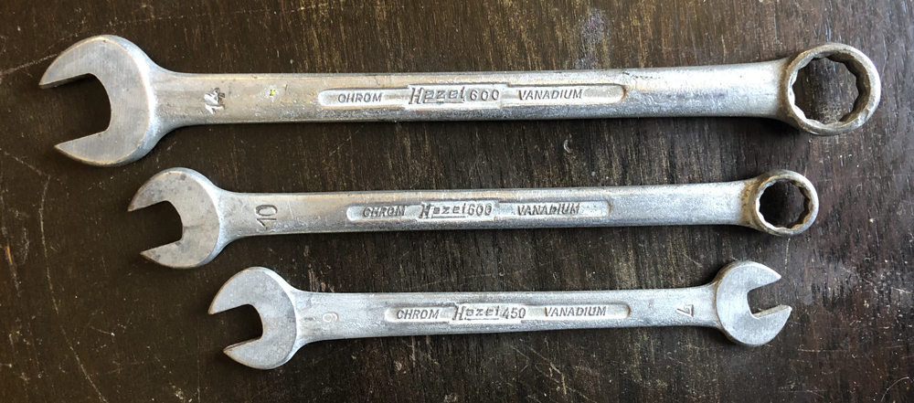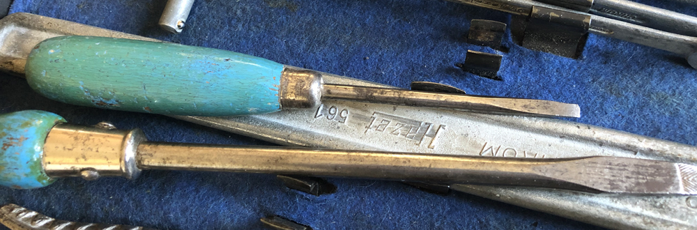 These matt silver tools have some patina, 1952 and 1953 screwdrivers can be seen with patchy green handles. Mikael Raivio explains: No text stamped. "Diamond" combination plier. 14mm, 10mm and 7 and 9. D.R.G.M. 114mm tube and 130mm handle.