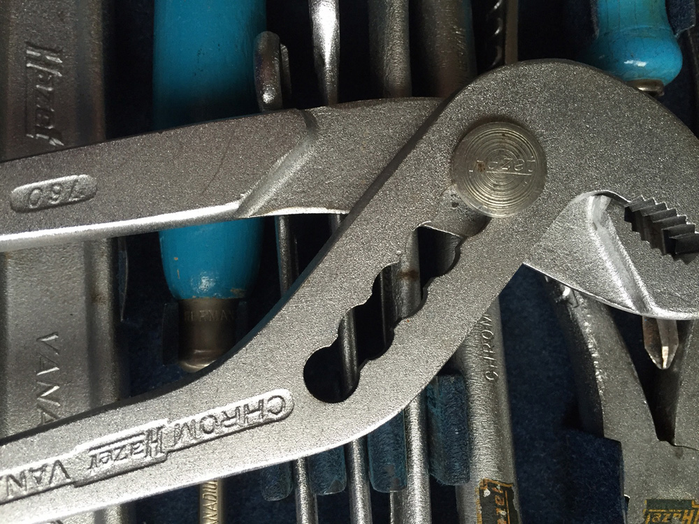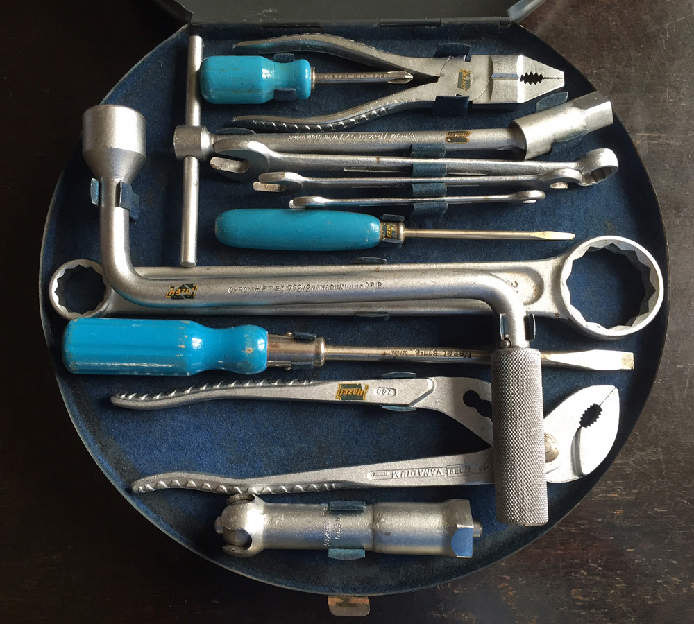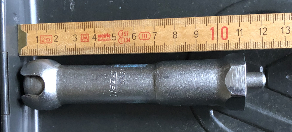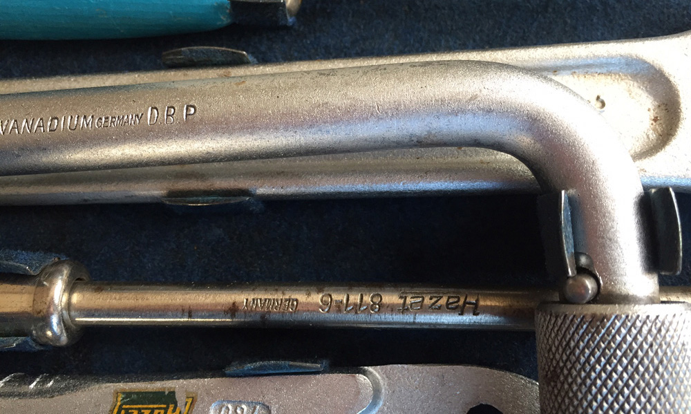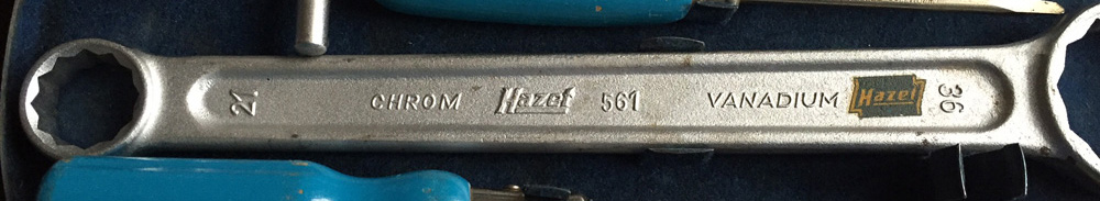 Even though the large 561 box wrench is changed to a double box Now the box inside is lined with spray-on flocking, including the clips. The 760 still has "Hazet" on the button. The 772/2 wheel lug tool now reads "D.B.P." 561 now with box wrench in both ends, 36 and 21mm. Tube is 112mm, handle 120mm. Flat rivets, square reinforcements. Now "DBP u Auslandspatente. Made in Germany".